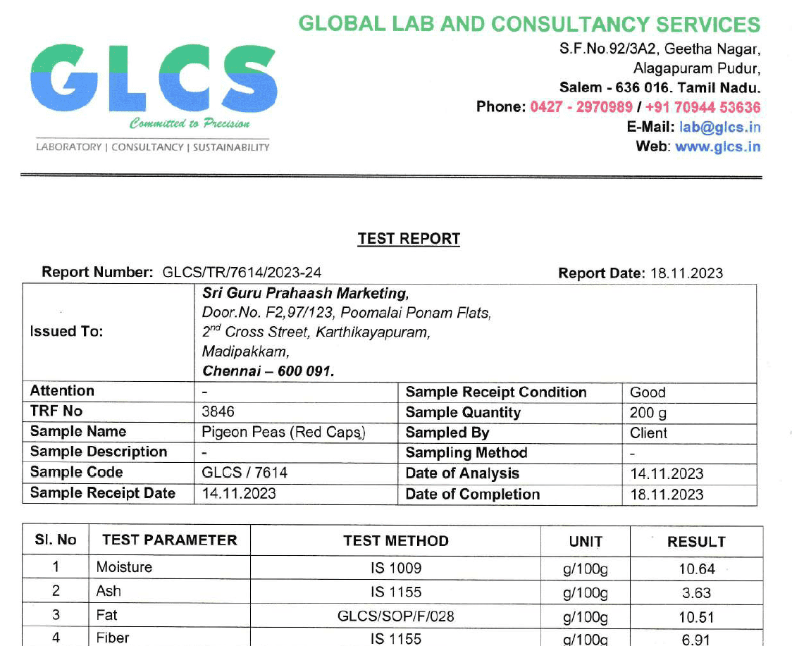 Our Product Pigeon Peas (Red Caps) is tested in the Laboratory and its test report is for your reference.